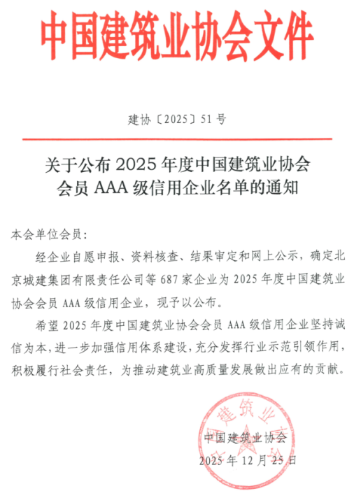 日前,中國建筑業(yè)協(xié)會公布2025年度中國建筑業(yè)協(xié)會會員AAA級信用企業(yè)名單,合肥市建投集團(tuán)所屬企業(yè)合肥市建設(shè)工程監(jiān)測中心有限責(zé)任公司再度榜上有名。